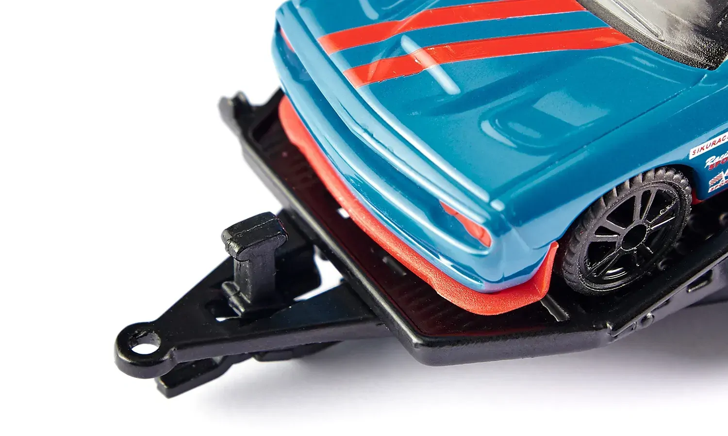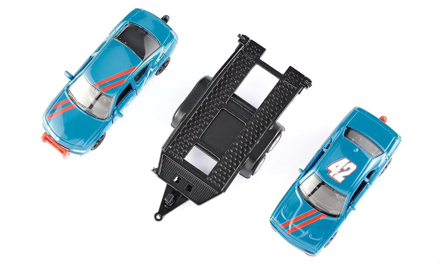Racing set with 8-cylinder powerWhat a combination! What paintwork! On the car trailer, the Dodge Charger pulls the Dodge Challenger SRT Racing to the next track test. The trailer is slowly tilted backwards, and the sky-blue V8 monster rolls backwards. Door open, final instructions to the driver. Starting number 42 is cleared to start the warm-up. The car roars out of the pit lane onto the course. The rubberised wheels on the sporting rims are warmed to running temperature, and then: Foot to the floor and release 700 HP. Vroom!
