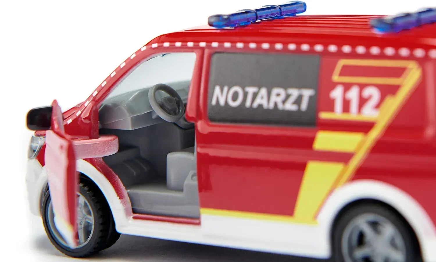 Efficient medical transport - An emergency call is received. In the emergency station the paramedics climb into rescue vehicle. At the hospital, the emergency doctor sets off in his specialised vehicle. With its sirens wailing loudly, blue lights flashing, and the conspicuous design, other road users become aware of the vehicle, and the emergency doctor reaches the incident location quickly and safely. The VW Transporter T6 is fully equipped with diagnostic equipment and two medical suitcases. The driver and passenger doors and the tailgate can be opened.